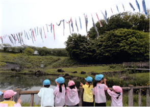 とんがり帽子のお屋根の時計台がそびえたつ園舎の目の前にある若宮公園や遊水地にも足を延ばし、楽しい毎日を過ごしています。