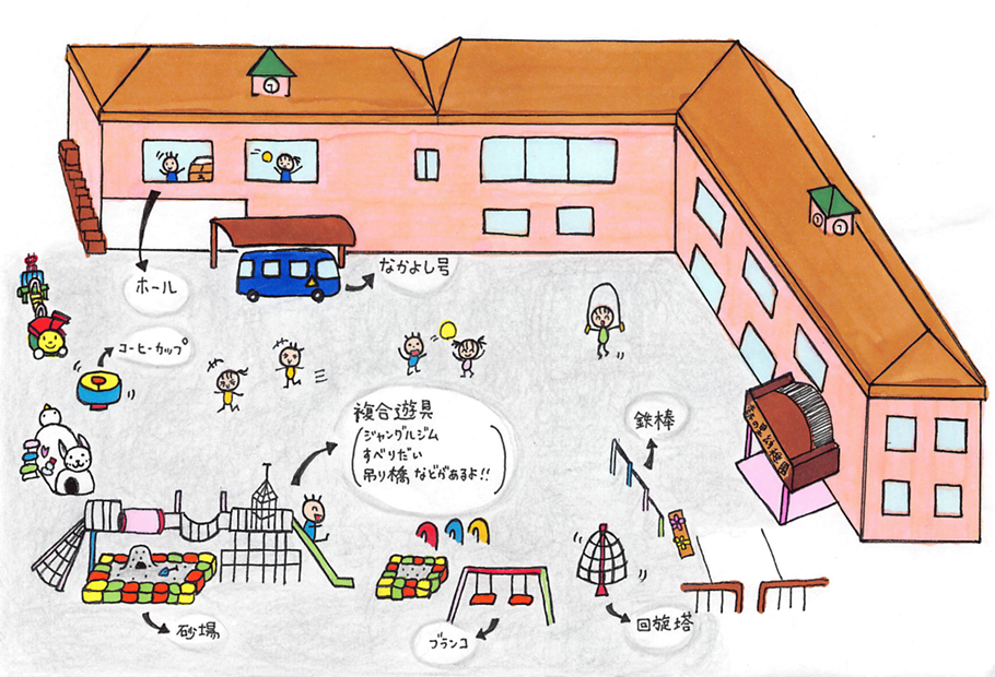 | その他 | ファミリールーム(時間外保育室)、ゆうぎ室(ホール)、ピロティー広場、職員室、保健室、図書スペース、会議室、応接室、休憩室 |